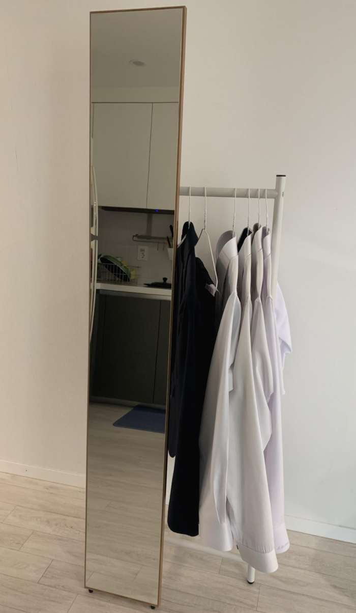 사이즈를 가늠할 수 있도록 옷을 좀 걸어보았으니, 직접 판단하시면 되겠다. 참고로, 사진에는 잘 안 나오지만, 거울 안쪽 부분이 아주아주 살짝 깨져있었다. 교환 신청할까 하다가, 겉으로 만져봤을 때는 아무 문제가 없고, 금 간 부분도 작정하고 보는 게 아닌 이상에야 잘 안 보일 것 같아서(사실 귀찮아서) 그냥 쓰기로 했다.
