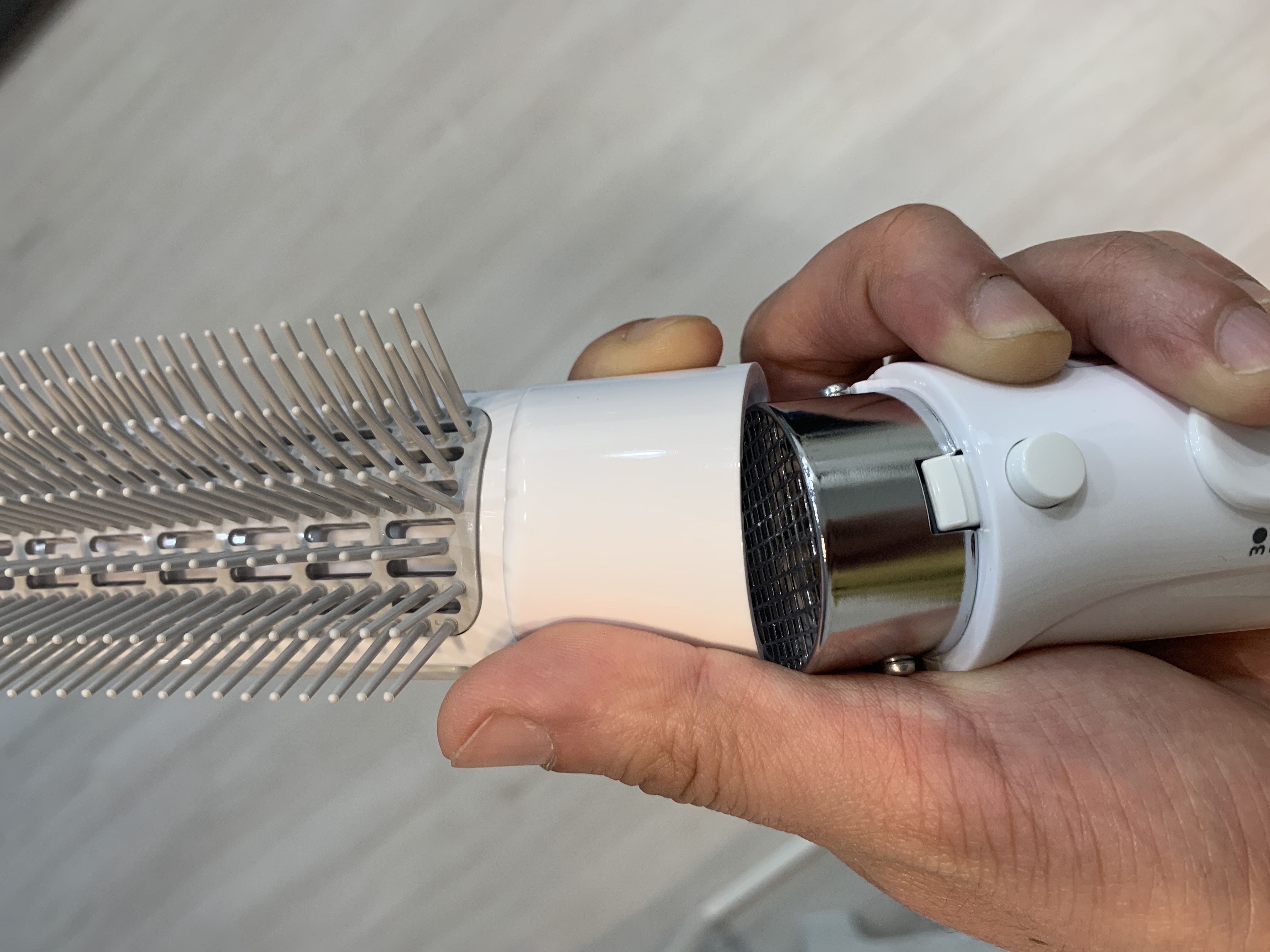 에어브러쉬(일명 빗드라이기)가 뭔지 잘 모르시는 분들이 있을 수 있는데- 빗 같이 생긴 쪽에서 차가운 바람, 애매한 바람, 뜨거운 바람(1~3단계)이 나오는 것이다. 그러니까 드라이기랑 같은 건데, 빗질을 한 상태에서 뜨거운 바람을 쏘기 귀찮은 사람들을 위한 제품이다.