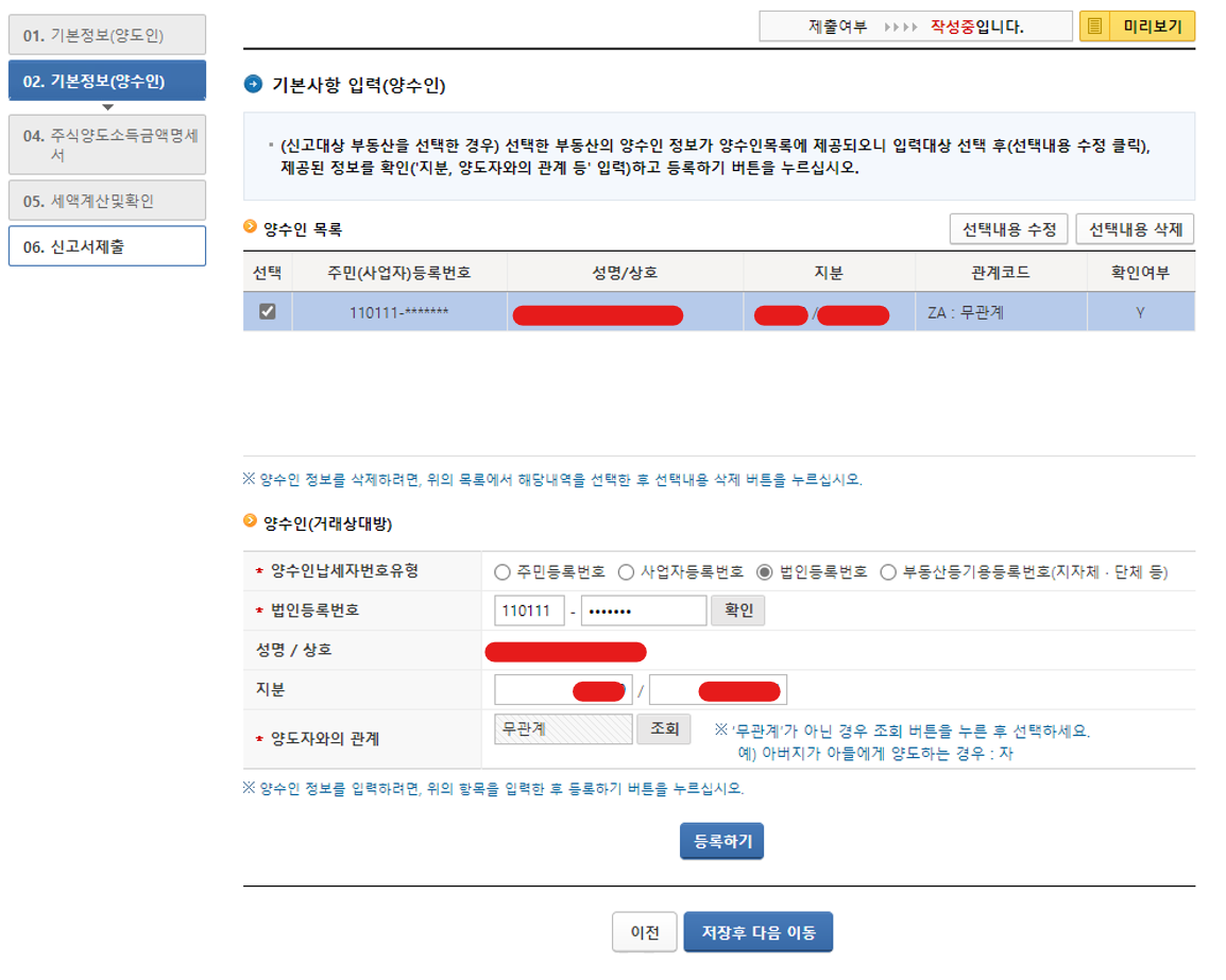 - 취득을 여러번에 걸쳐서 한 경우는 위의 주의사항에서 안내한 바와 같이 취득기준 별로 나누어 입력하여야 함.