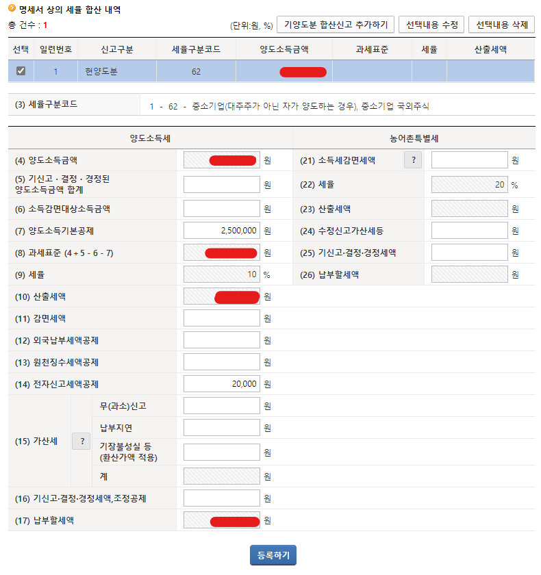 이후, 등록(추가)하기 를 클릭하면 아래와 같이, "주식양도소득금액계산명세서상 목록이 생성됨.