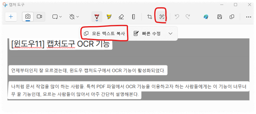 언제부터인지 잘 모르겠는데, 윈도우 캡처도구에서 OCR 기능이 활성화되었다.