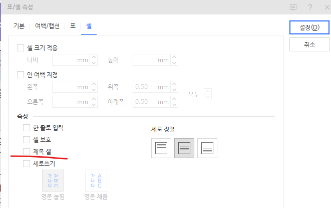 - '속성' 항목에서 '제목 셀' 옵션에 체크 표시를 하고 '설정' 버튼을 누른다. 이렇게 하면 선택한 셀들이 제목 셀로 지정된다.