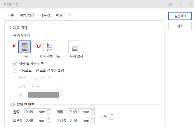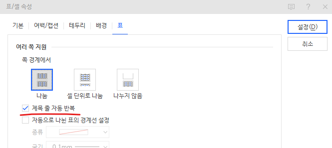 다. '표' 탭 설정: 제목 줄 자동 반복 활성화