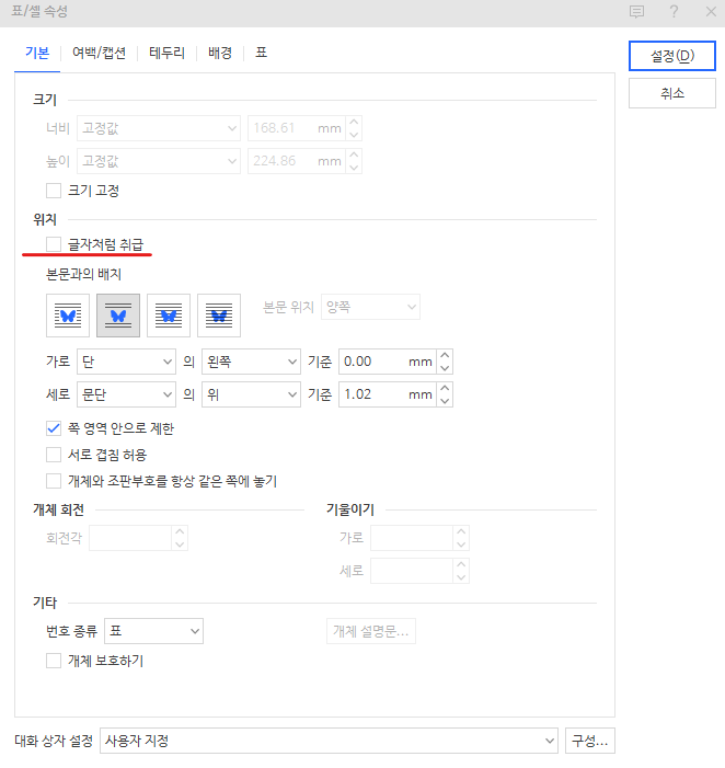 - '위치' 항목에서 '글자처럼 취급' 옵션에 체크 표시가 되어 있다면, 반드시 체크를 해제한다. 이 옵션이 선택되어 있으면 표가 하나의 큰 글자 덩어리처럼 인식되어 페이지 경계에서 자동으로 나뉘지 않는다.